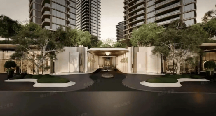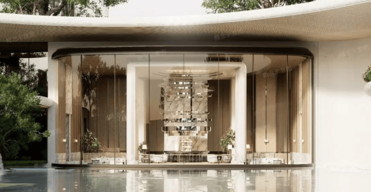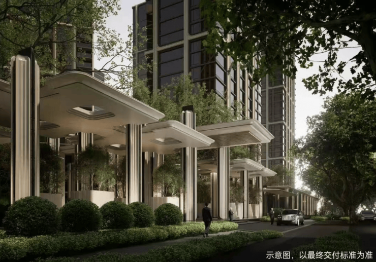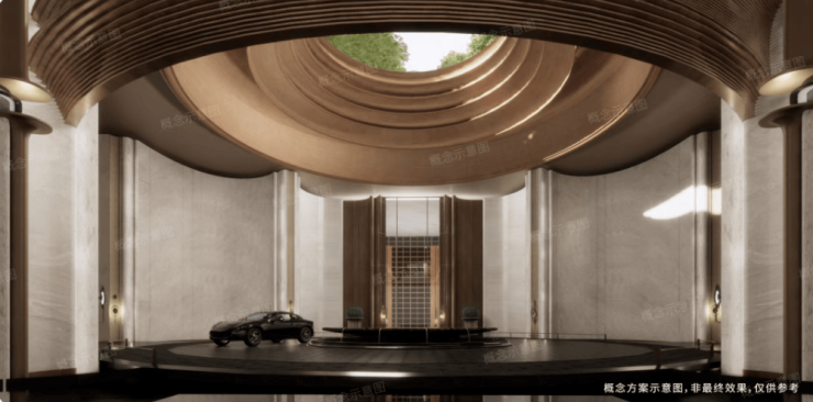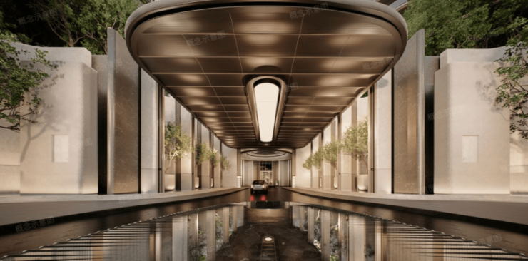 项目采用立体浮岛底盘设计,底部3层架空抬高,裙房布置万象系商业及社区配套,规划「地下落客-首层迎宾-上层漫游」三重立体归家礼序,约9米挑高车马厅搭配圆穹吊顶。