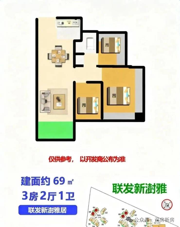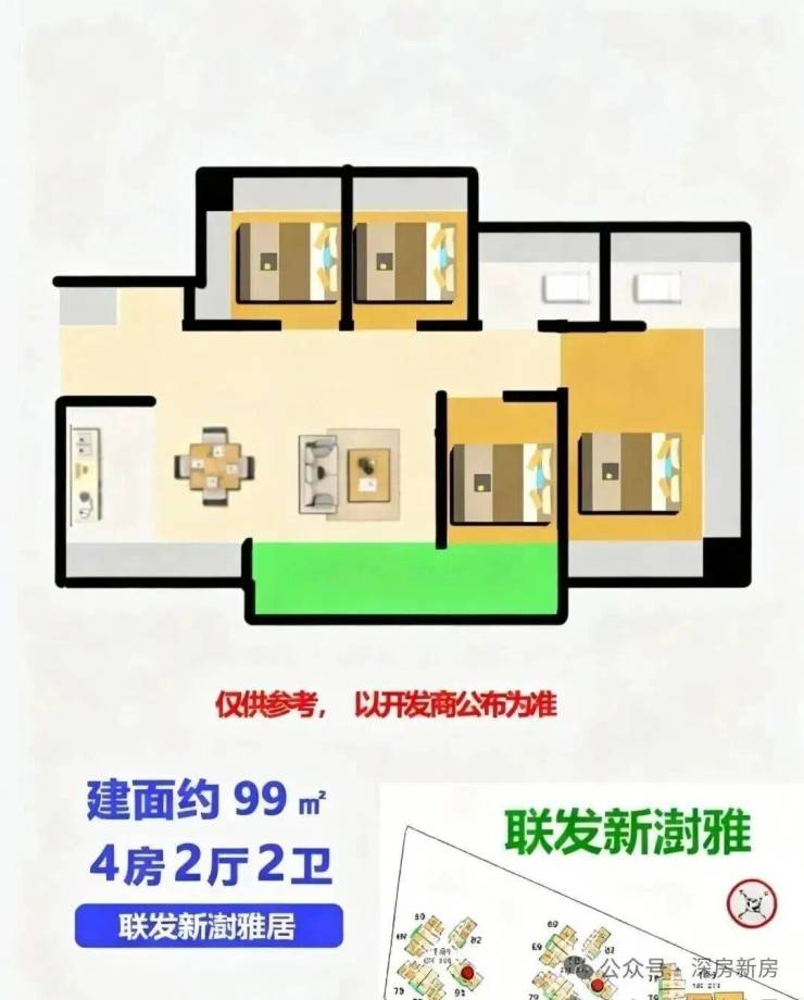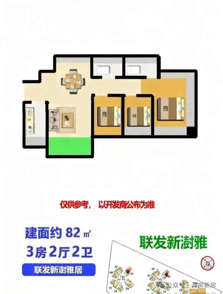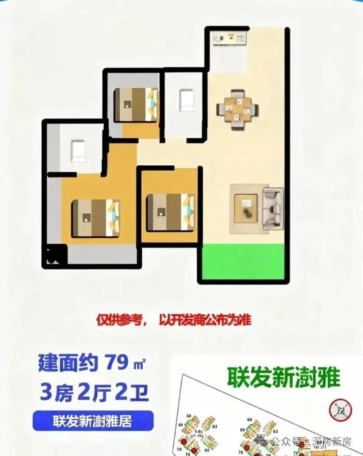 龙华红山,联发新澍雅居预计2026年一季度取证入市,户型相当炸裂,面积有69平的2+1房1卫,79-82平的3房2卫,99平的4房2卫户型,共332套房源,价格方面可以参考附近前期入市的联发臻著雅居,备案均价7.3万/㎡,当时折后均价约6.4万/平,期房精装交付,目前营销中心暂未开放,户型图供参考