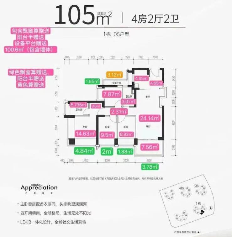 项目主推建面约72-105㎡的3-4房,产品基本在98%使用率,最高实用率甚至能突破100%,相较于新规前普遍75%左右的得房率,堪称是“王炸”级别的存在!