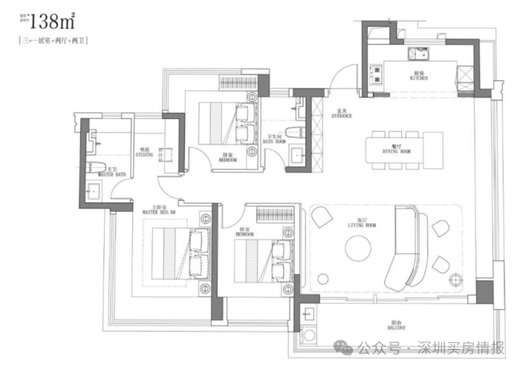 竖厅南北通透格局,进门入户玄关,客厅4.3米开间,餐客厅分离设计,四开间朝南,全屋八面飘窗,主卧做到了270度转角无柱飘窗,U型厨房,卫生间干湿分离,得房率约95.2%(包含赠送),客厅连接次卧出7.1米长的观景大阳台,全部主朝西南向,看大运公园景观。