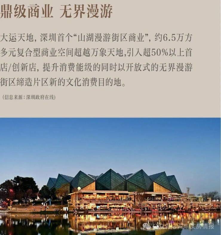 项目自带有1000㎡社区底商,一路之隔就是大运天地,约1.7公里还有星河cocopark,里面有山姆会员商店,算是目前龙岗最高端的商业,距离约4公里还有万科广场,世贸百货,仁恒梦中心等大型商业体,在未来大运枢纽还会打造25万㎡的高端商业体。
