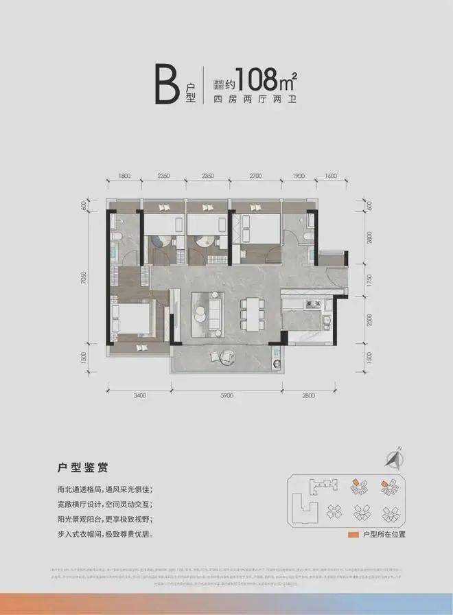 :横厅布局,客厅开间5.9-6.6米,南北通透,主卧套房设计;