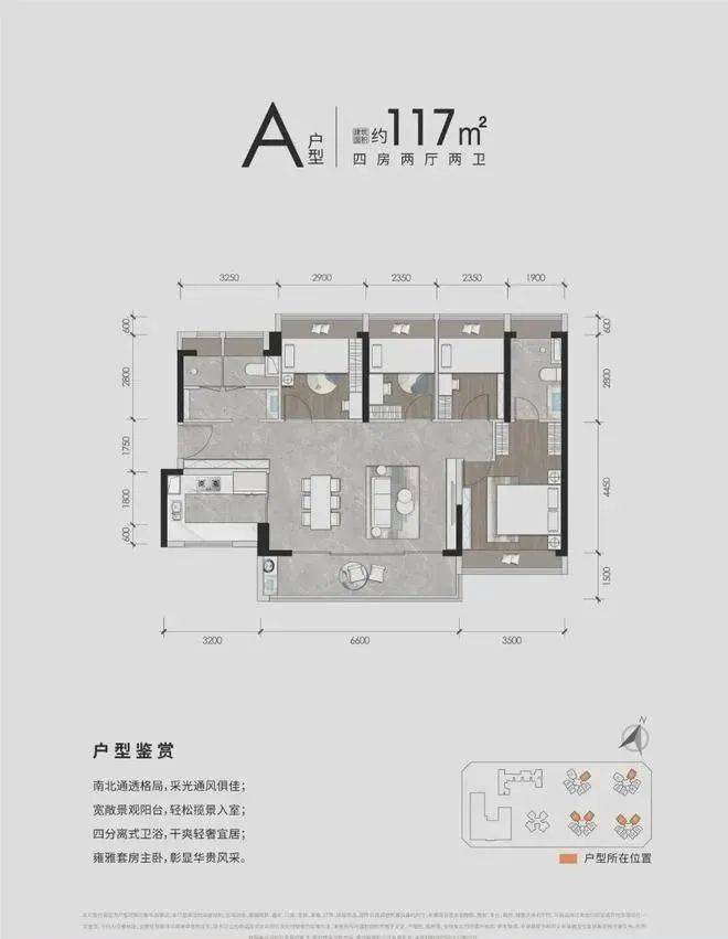117㎡ 4房2厅2卫:稀缺南北通透、大横厅阔绰4房,约6.6米阔景阳台 ,四分离卫生间