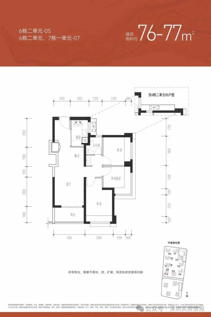 【约76㎡三房一卫】户型分布:只分布在6栋2单元和7栋1单元,共258套