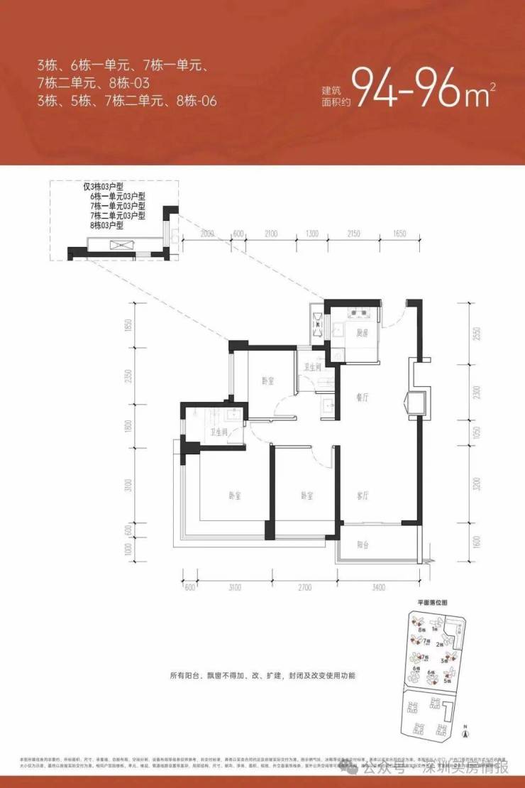【约94㎡三房两卫户型分布:每一栋都有分布,也是主力户型,共1015套①户型分析:有横厅和竖厅两种户型;玄关、冰箱、储物/电视柜位置为凹槽设计,墙面平整美观;U型厨房,操作动线流畅;三开间朝南、卧室均带飘窗;超17㎡的开阔主卧,配合L型长飘窗,270°观景;三分离卫生间,干净舒适;②朝向:西南、东南向③视野:东南朝向的看社区花园社区泳池,西南向的看城市道路、施工建设