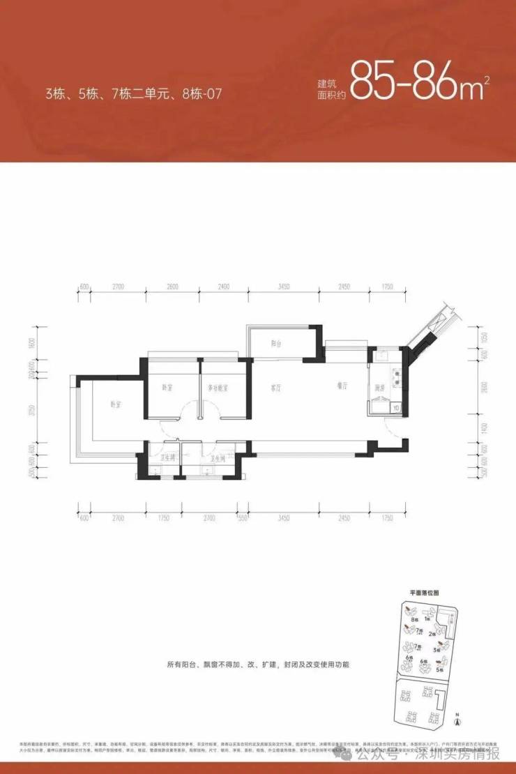 ①户型分析:小面积、低总价,最佳上车首选户型;全南向排布户型,多飘窗的设计,采光通风不错;户型方正,动静分区的设计注重隐私性;明厨明卫,三分离洗手间设计;②朝向:西南、东南向③视野:小区外围,临万丰路,看城市风景,施工建设区域【约85㎡三房两卫】户型分布:分布在7栋2单元、8栋、3栋,共710套,①户型分析:有横厅和竖厅两种户型,全屋7个飘窗、13米采光面,非常通透;预留超多收纳空间主卧双面采光,景观视野更开阔②朝向:东北、西北朝向③视野:社区花园和社区楼栋