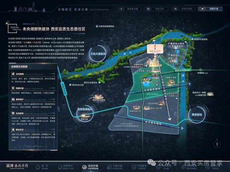 ③醇熟板块、西安品质生态居住区:未央湖片区将打造成为融合休闲度假、高端居住、颐养医疗的生态宜居地,并配以地铁、教育、商业等全维生活场景,成就城市理想生活范本。