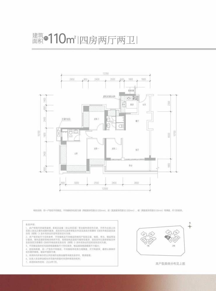 110㎡的4房2厅2卫,设计的是经典竖厅格局,客厅3.8米开间,进门独立玄关,LDKB一体化设计,S墙设计预留冰箱卡槽位,4个卧室分别做到了3.8米/3.2米/2.55米/2.44米的宽度,U型厨房,公卫三段式分离设计,得房率约:95%(包含赠送),客厅连接次卧出6.2米的大阳台,朝西南向。