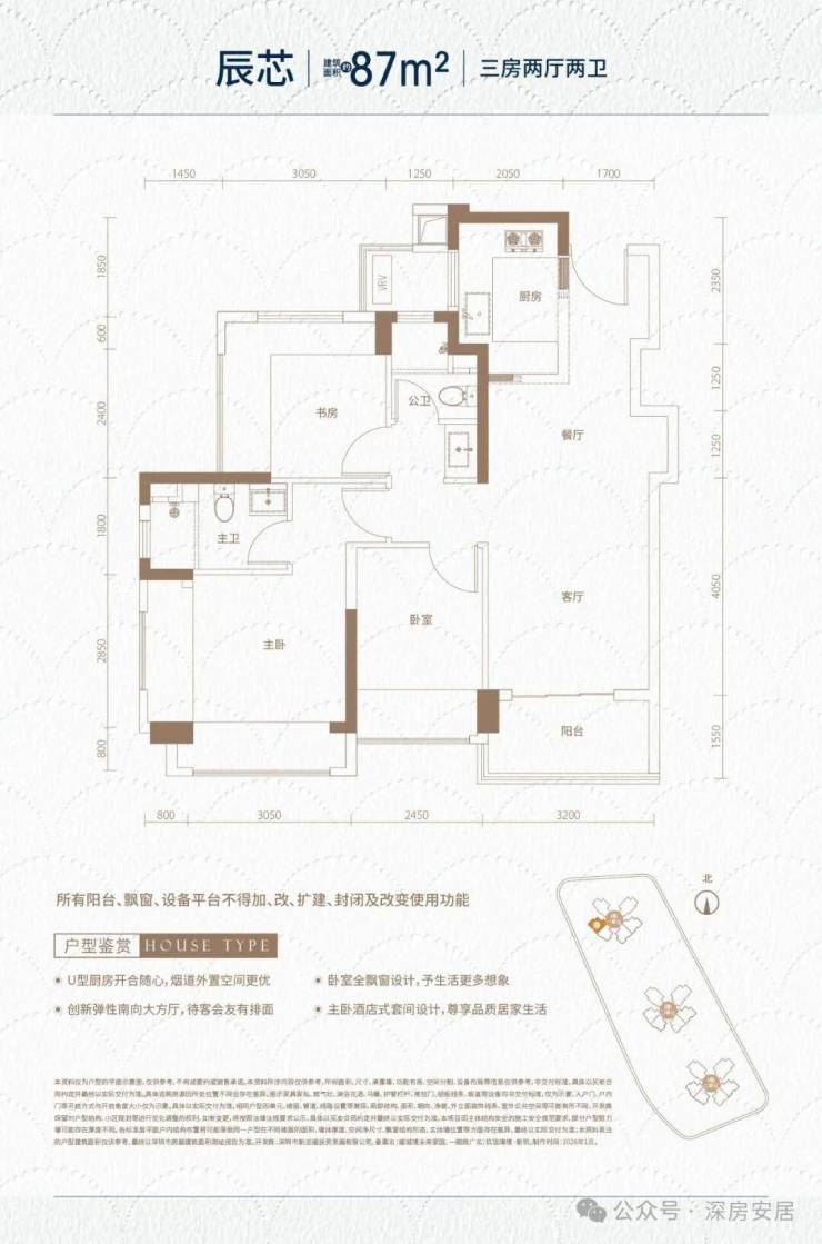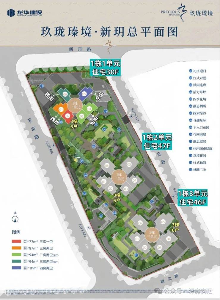 龙华观澜,玖珑瑧境·新玥(备案名:福城境未来家园)计划将在2026年3月份取证入市,本次首推1栋1单元,共167套房源,面积有77㎡的3房1卫,87-94㎡的3房2卫,111㎡的4房2卫户型,全南朝向,也是观澜第二个新规建设的新盘,得房率高达98-105%。