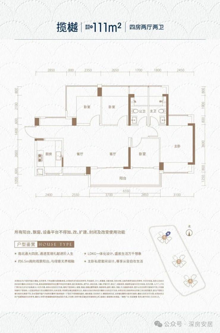 111㎡的4房2厅2卫,设计的是横厅南北通透格局,独门独户,进门入户玄关,客餐厅6.25米开间,LDKB一体化,全屋10面飘窗,主卧南北通,分别做到了主卧16.6㎡/次卧10.54㎡/次卧9.27㎡/次卧7.41㎡(包含墙体飘窗),U型厨房,卫生间干湿分离,得房率约102%(包含赠送),客厅连接次卧出6.55米长的大阳台,约10.8㎡主朝东南向。