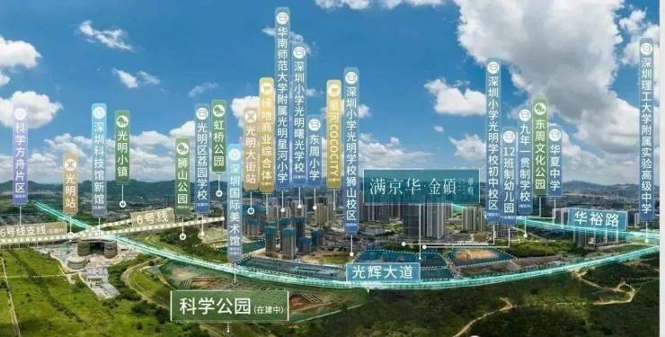满京华金硕悦府,位于深圳光明区光明科学城“一心两区”的核心区域,紧邻占地208万平方米的科学公园,属于光明规划中“最宜居、居住板块最大”的片区。项目北侧与科学公园仅一街之隔,东、南侧为深圳小学光明学校狮山校区及初中校区,周边市政配套规划密集,如深圳科技馆新馆、国际美术馆等均在建设中,预计2026年前全面落成。