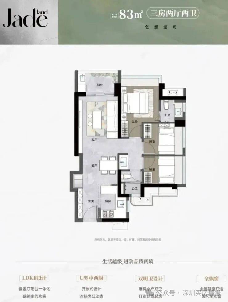 5栋83㎡的3房2厅1.5卫,设计的是竖厅格局,进门入户玄关,LDKB一体化,S墙设计预留冰箱卡槽位,U型厨房,主卫少了淋浴,公卫三段式分离,得房率约92%(包含赠送),阳台西北朝向。