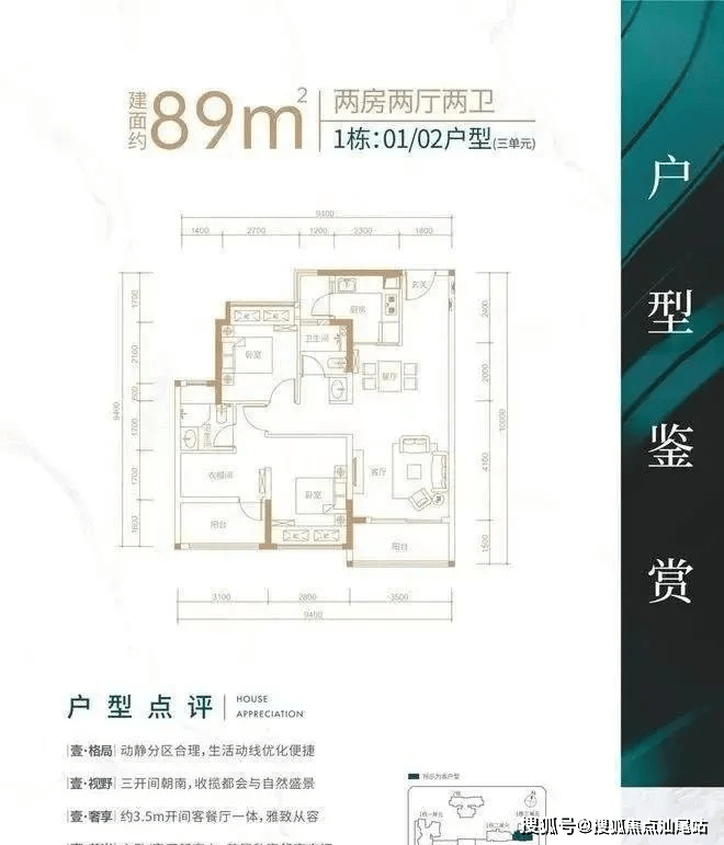 89㎡3房2厅2卫(单价7-7.6万总价615-680万)客厅南北通朝南带阳台,3房朝南该户型分布在1栋2单元02户型