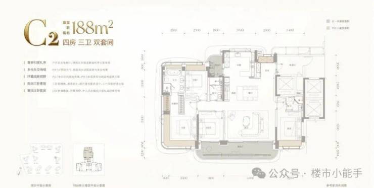 从产品设计来看,这一档更偏向改善型大平层逻辑,比如全景舱式视野、南北通透双阳台、较大的客餐厅尺度,以及三套房结构,整体更强调家庭居住的完整性。