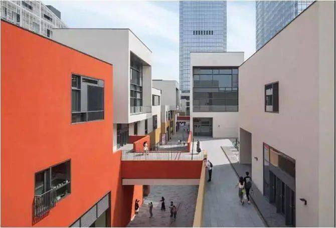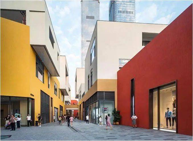 店铺外立面以红、橙、黄色等暖色调,与蓝天白云相得益彰,并与整个Loft灰白建筑形成对比,提升商业空间视觉感。线条流畅简洁,空间开阔,如同置身于纽约或伦敦的SOHO区,既是对集市型商业精神的回归,也迎合了当代都市人对个性化的需求。