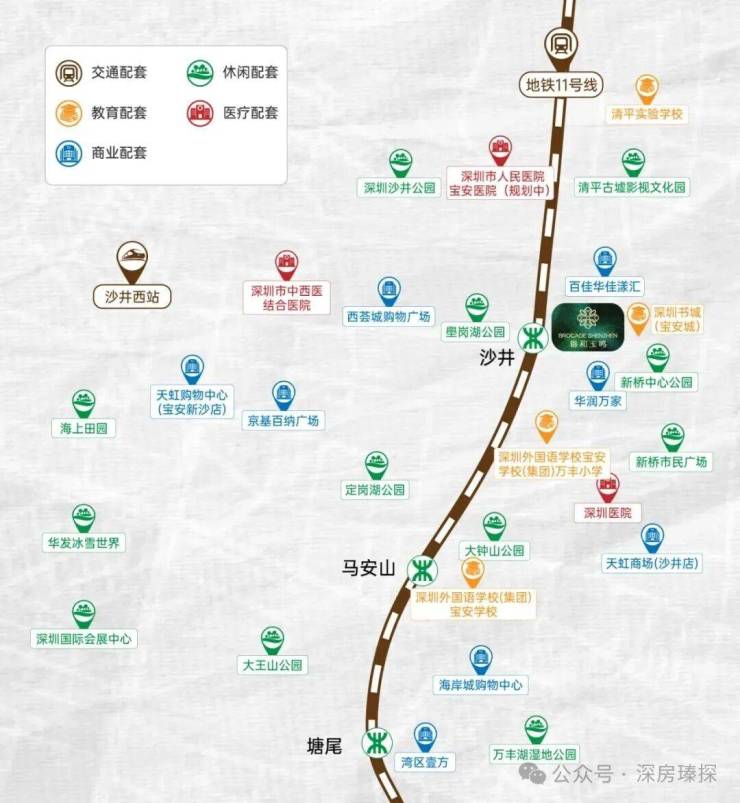项目还拥有海陆空轨铁六维交通网络,包括广深高速、外环高速等自驾路线。广深高速新桥出口驾车约5分钟可达,外环高速新桥站约10分钟车程,可快速连接福田CBD、宝安机场等核心区域。穗莞深城际沙井西站驾车约10分钟可达,通过公交653路可直达该站,未来穗莞深城际机前段工程建成后,从沙井西站至前海核心区仅需15分钟,实现与广州、东莞的快速连接。