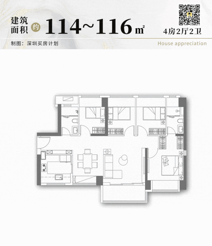 ◎ 建面约114-116㎡4房2卫户型: