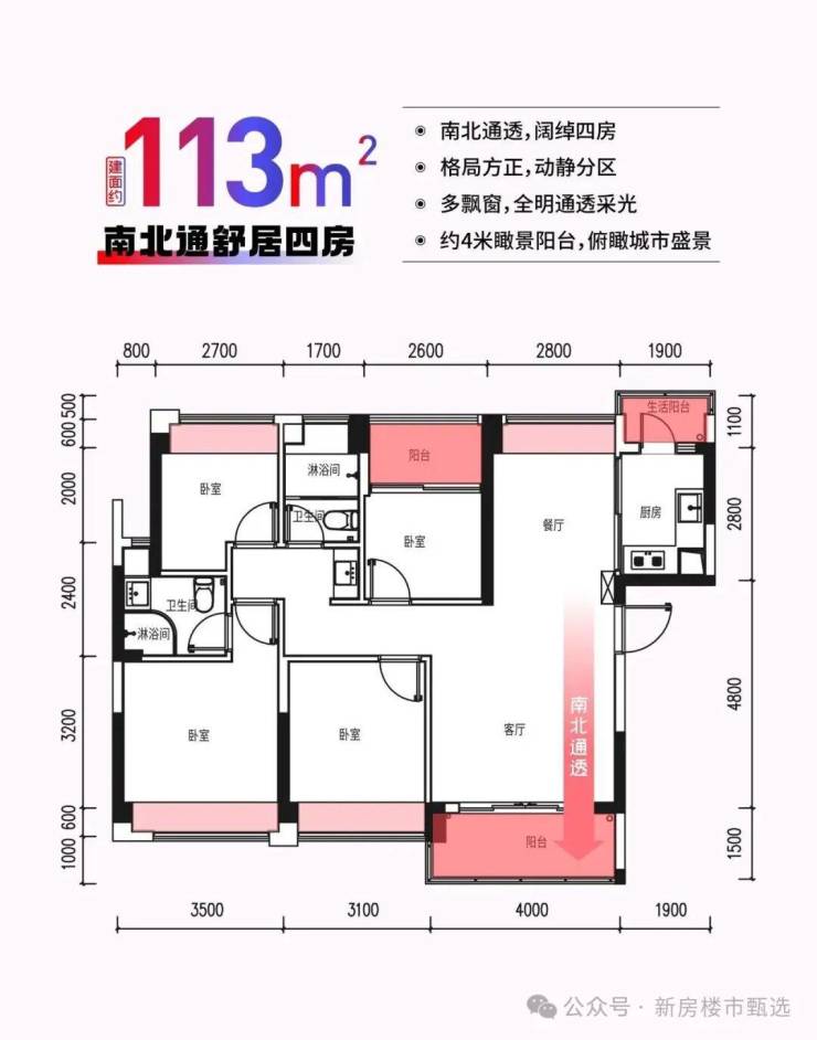 建筑面积约113-120㎡四房两厅两卫,稀缺南北通透,三阳台设计,约4米阔景大阳台。