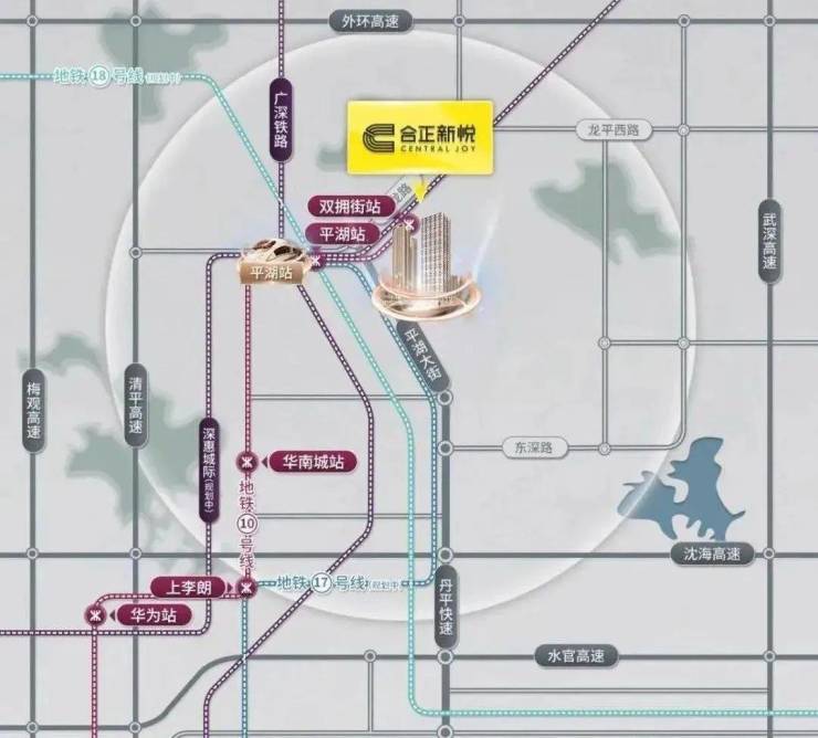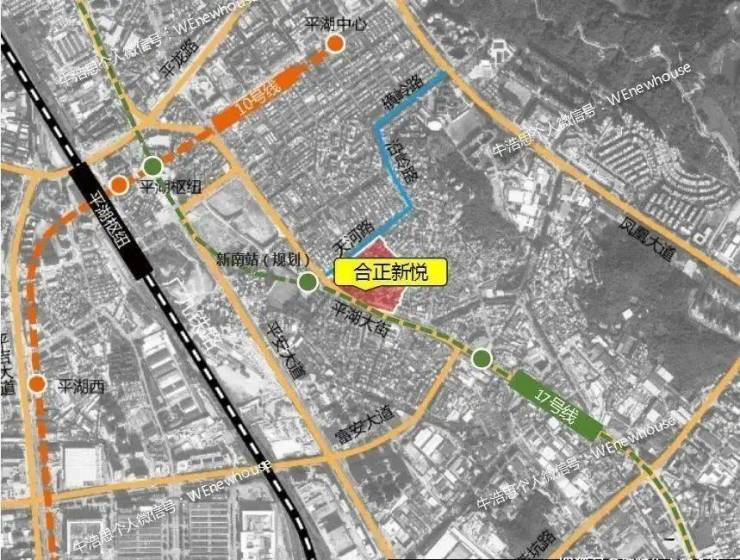 交通配套: 合正新悦所在片区交通便利,距离平湖枢纽站仅约800米(据百度地图测量,仅供参考),周边还有已经开通的地铁10号线平湖站,规划中的17号线新南站、18号线,三地铁环绕,轻松通达全市各区。