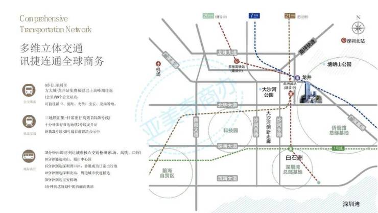 交通枢纽:深圳北站、西丽高铁站、宝安机场;深圳湾口岸