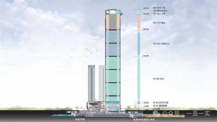 项目的主塔楼高达358.7米,集甲级办公、高端办公、五星级酒店、临海观景台、城市会客厅和天际观景台于一体,形成了一个多元复合的摩天都会。设计团队在高密度的城市发展背景下,通过重新梳理区域内交通流线,解决了多种不同业态的空间需求,并依托地铁轨道交通,打造了一个能跟城市TOD系统无缝对接的现代化垂直综合体。