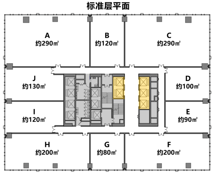 综合实用率:约70% 标准层面积:约2156㎡ 标准层层高:约4.2m