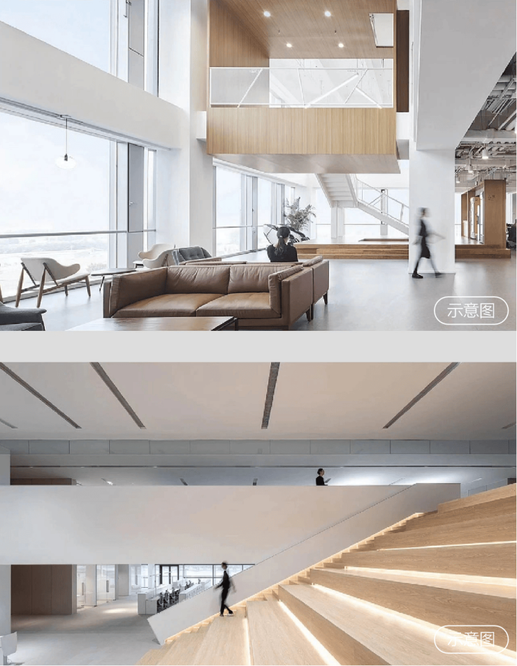 部分楼层双层通高,可作为企业挑高前台、阶梯路演厅等,多功能空间自由组合