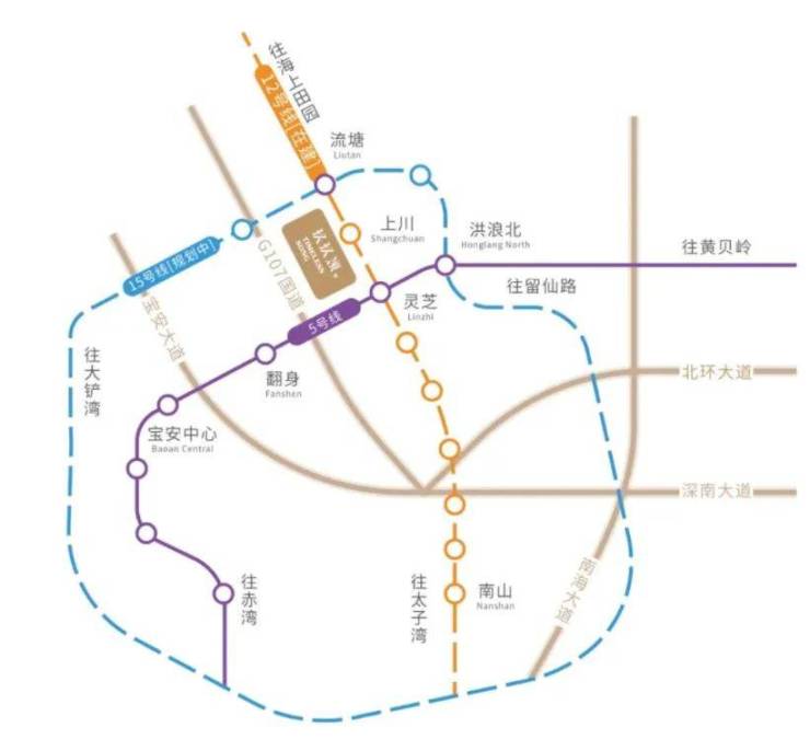 家门口的双地铁,半小时通达全城项目距离12号线上川站F2出口约100米;距规划中15号线(流塘站)约700米;北环大道、G107国道、宝安大道在侧,半小时通达全城。