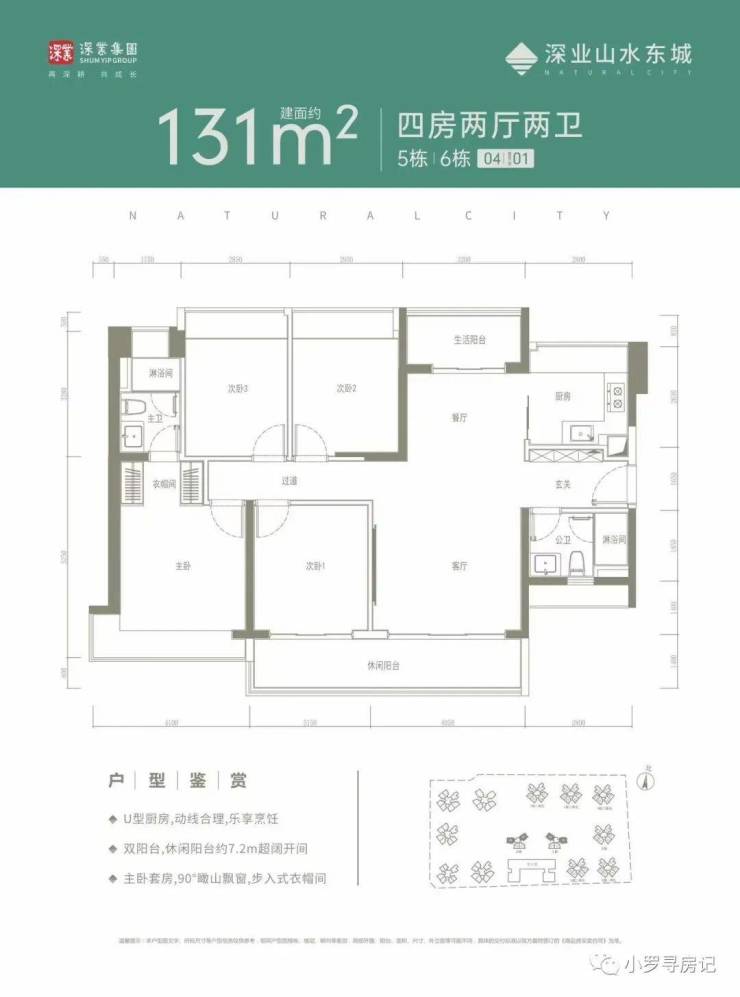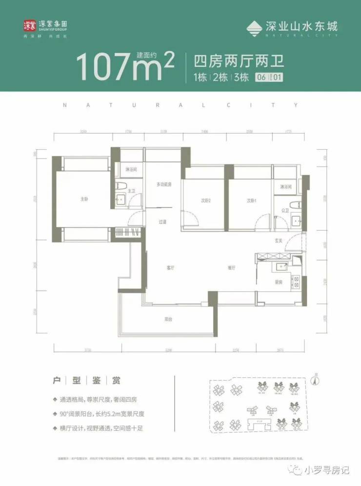 107㎡的4房2厅2卫,设计的是横厅南北通透格局,客餐厅一体化,4个卧室分别做到了3.25米/2.55米/2.4米/2.15米的宽度,主卧南北通透,长5.2米的L型大阳台,U型厨房,卫生间干湿分离,得房率:79.96%(不含赠送),阳台主朝西南或东南向。