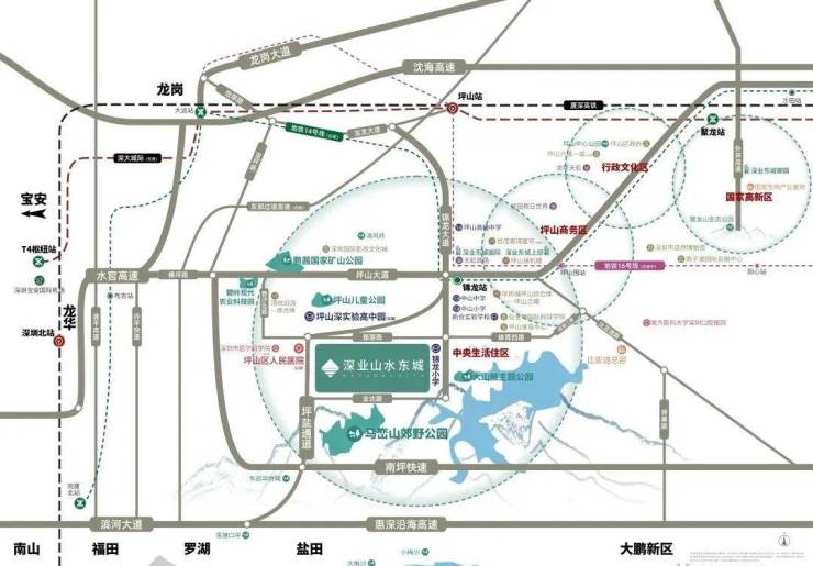 深业山水东城,位于坪山区碧岭街道锦龙大道和振碧路交汇处西南角,从板块来说可以说是属于锦龙片区,属于比较南端的区域,南侧背靠马峦山脉,东侧邻近大山陂水库,西侧毗邻深实验学校高中园,还有坪山人民医院新院区。