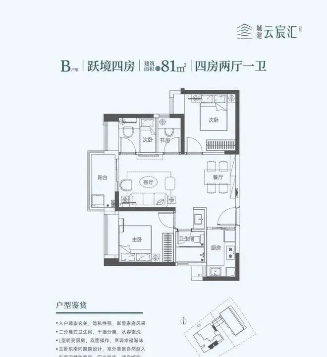 81㎡的4房2厅1卫,设计的双龙抱珠格局,餐客厅一体化,L型厨房,东南朝向。