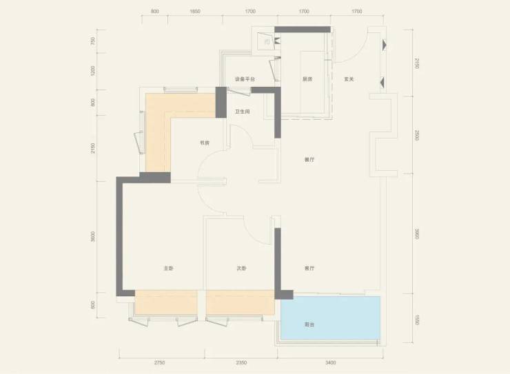 76㎡的3房2厅1卫,设计的是经典竖厅格局,客厅3.4米开间,LDKB一体化,S墙设计预留冰箱卡槽位,3个卧室分别做到了主卧10.99㎡/次卧7.3㎡/次卧5.91㎡(实测面积,去掉墙体),U型厨房,卫生间三段式分离,还带1个设备平台,赠送面积高达12.71㎡,实际得房率约97%(包含赠送),西南/东南或西北朝向。
