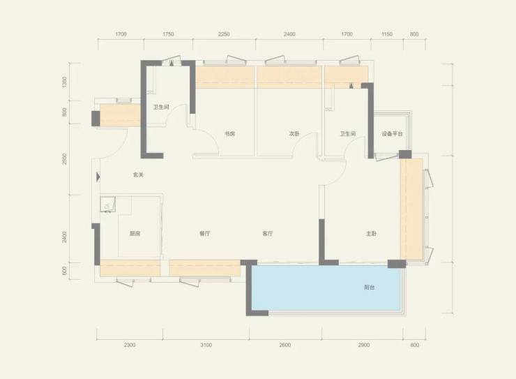 89㎡的3房2厅2卫,设计的是横厅南北通透格局,进门入户玄关,客餐厅5.7米开间,LDKB一体化,四开间朝南,3个卧室分别做到了主卧11.42㎡/次卧7.31㎡/次卧6.93㎡(实测面积,去掉墙体),主卧还带1个设备平台,主卧连接客厅出5.5米长的超大阳台,U型厨房,卫生间三段式分离,赠送面积高达20.09㎡,实际得房率约101%(包含赠送),西南/东南朝向。