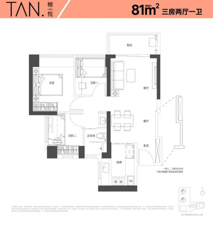 81㎡的3房2厅1卫,设计的是竖厅格局,进门入户玄关,客厅3.5米开间,LKDB一体化设计,有1个次卧做的双飘窗,U型厨房,卫生间三段式分离,得房率:74.34%(不含赠送),全部西北朝向。