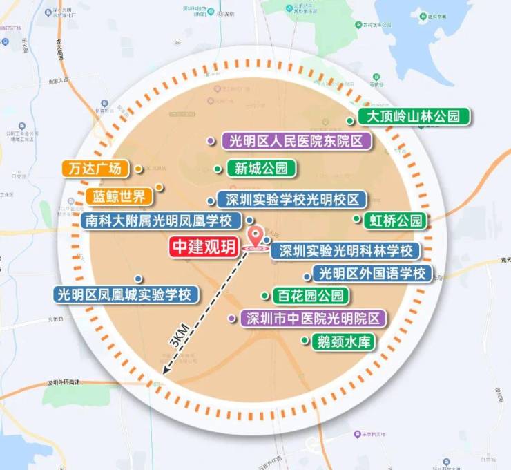 中建观玥名邸,位于光明区凤凰街道光侨路与观光路交汇处东南侧,地处光明科学城核心区与凤凰城板块交汇处,是光明高铁站板块最后一块住宅用地。作为光明科学城"一心两区"战略布局中的关键节点,项目紧邻区政府、文化艺术中心等行政文化配套,2公里范围内覆盖蓝鲸世界、万达广场等成熟商圈,坐享"15分钟社区生活圈"便利。依托光明科学城建设世界级原始创新高地的规划,项目所在区域将受益于大量高端科学人才涌入带来的区域价值提升,同时享有"北林、中城、南谷"差异化城市风貌中的"乐活城"特质,兼具科技感与宜居性。