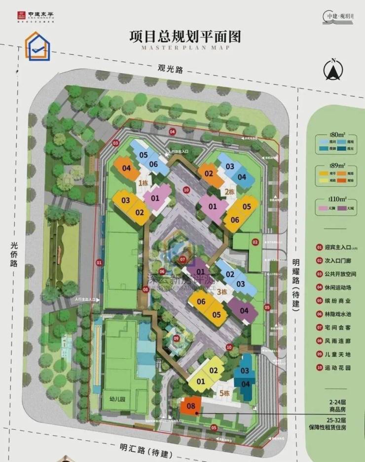 观玥名邸,总占地面积约1.43万㎡,总建筑面积约11.49万㎡,计容建筑面积约7.91万㎡,容积率5.4,绿化率35.1%,共由4栋总高32-33F住宅组成,其中1/2/3栋商品房33F,5栋商品房+保障房32F,4栋是1所6班制幼儿园。