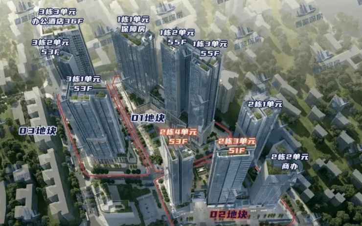 02地块,规划总建面约16万㎡,容积率9.12。规划住宅建面约8.37万㎡,商业建面约1万㎡,办公面积约1.7㎡。