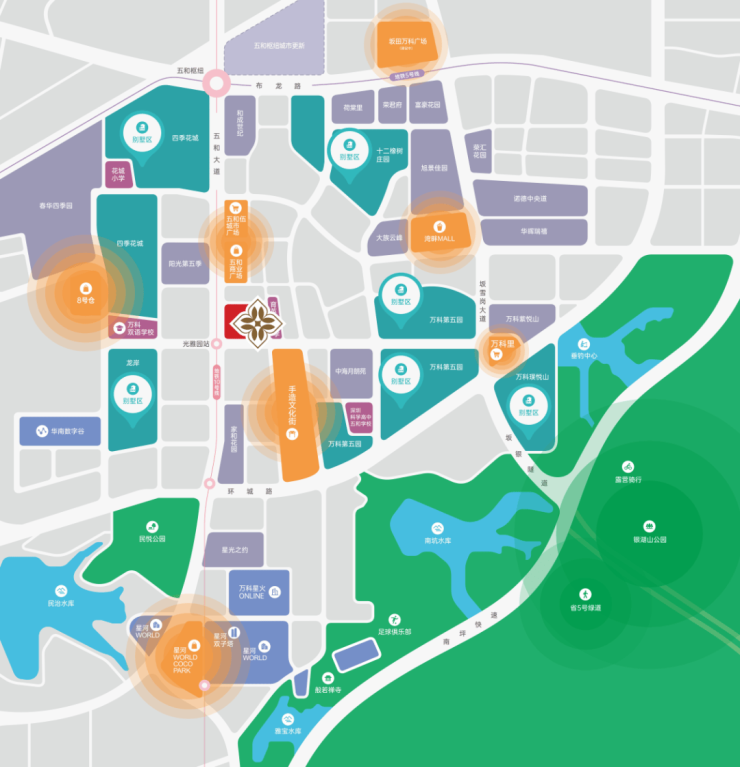 北侧160米:五和商业广场、宝银商业广场,以餐饮、便民服务为主,适合日常聚餐与生活服务。西侧650米:8号仓奥特莱斯,华南区家“OUTLETS+LOFT”综合体,汇聚200+国际国内一二线品牌折扣店,搭配特色餐饮、BABYCITY儿童教育、豪华影院等,满足家庭购物、休闲娱乐需求。