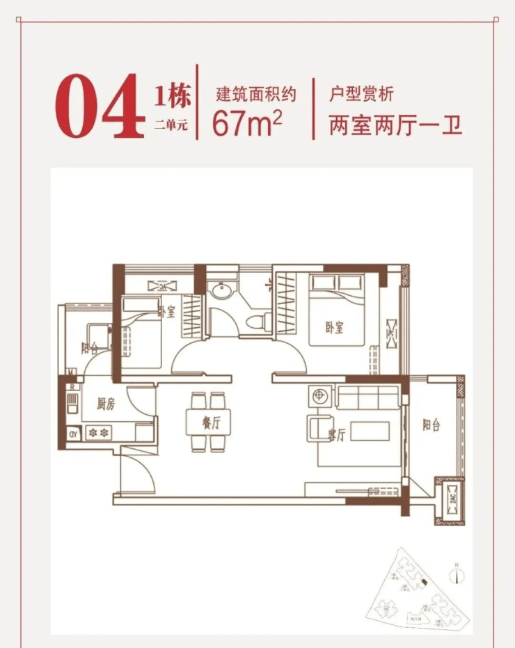 约67㎡两房:东南朝向,片区内唯一在售2房。
