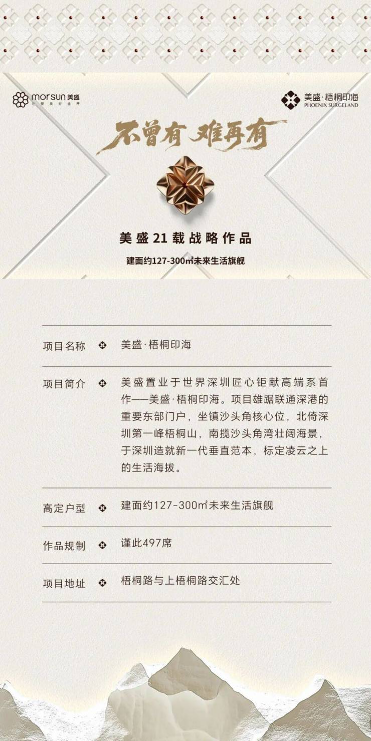 盐田沙头角即将在2026年3月底推出一个引人注目的新盘——美盛·梧桐印海(备案名:观山海云府)。此项目位于原沙头角保税区第四生活区城市更新单元用地,此次将首推3栋,共159套住宅