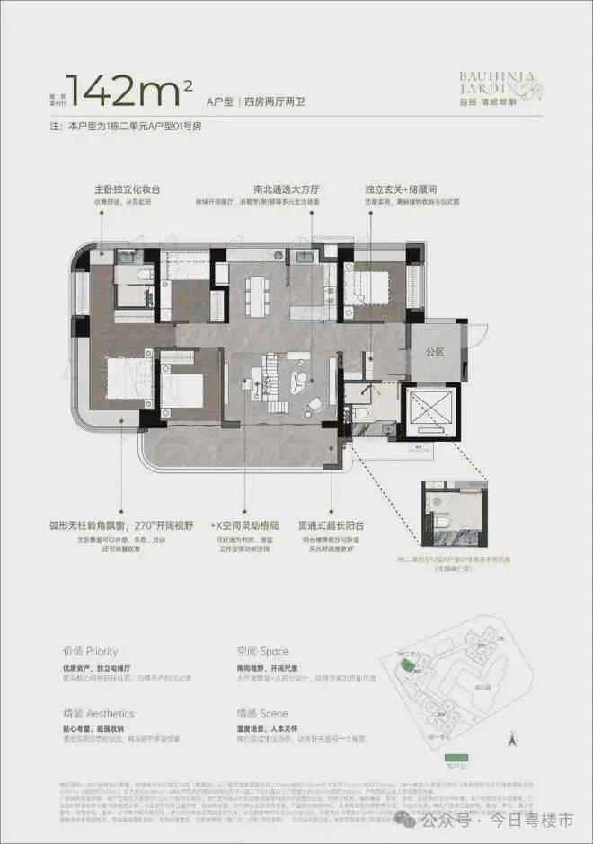双龙抱珠户型,整个户型非常通透。书房分布于客厅另一侧,难得的双面采光+270°景观视野。主卧南北通透,景观面开阔。