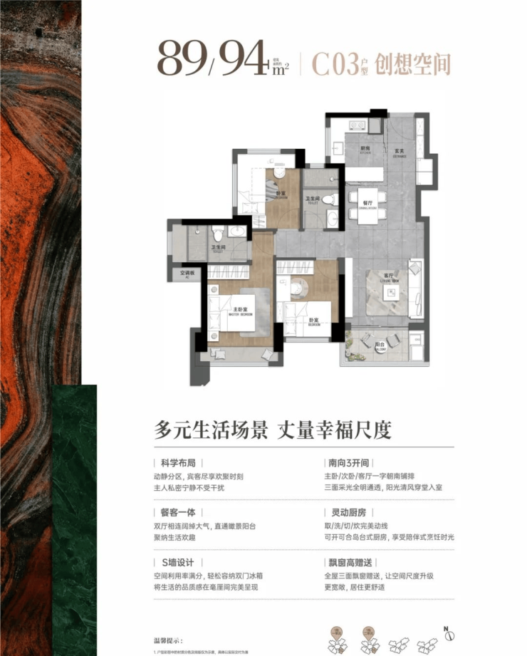 89-94平:3房2厅2卫,套内净使用率在80%,东南朝向