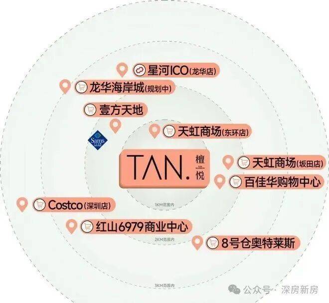 项目自带特色商业街,并且紧邻项目有天虹商场(东环店),距离壹方天地(建面约60万㎡航母级体验式商业集群)约1.5km,周边还有山姆会员店、天虹商场(坂田店)以及Costco会员旗舰店等,一站式满足不同生活需求。
