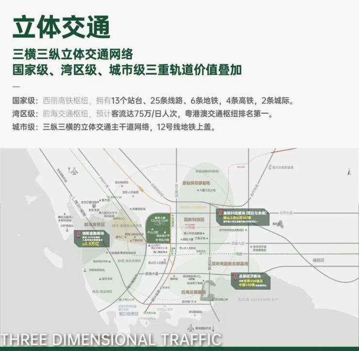 地铁上盖物业,无缝接驳地铁12号线中山公园站,经深南大道、月亮湾大道,直通前海。前海交通枢纽,海、陆、空、轨四维立体交通,畅达粤港澳大湾区各大城市。