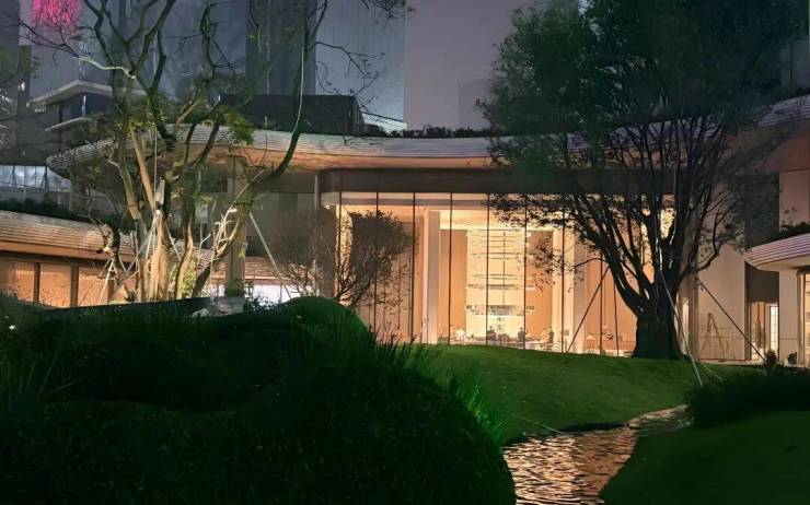 项目核心景观为5.5 万㎡三层立体台地园林,展示区即中央下沉庭院,是整个社区景观灵魂,设计理念:一心十岛、浮屿藏海、山谷秘境。展示区采用双下沉山谷式设计,区别于平面园林,利用场地高差打造高低错落、内外通透的立体景观;中央约 800㎡镜面无边水景,模拟前海潮汐海面,是展示区视觉核心;整体抬地 12 米(三层架空底盘),住宅首层相当于市政地面三层高度,完全避开道路噪音、俯瞰园林海景。全冠移植名贵乔木、多层次乔灌草,滨海耐盐树种,营造森海秘境氛围;大面积弧形石材、水洗石、木纹铝板,柔和曲线呼应海浪形态,拒绝生硬直角。