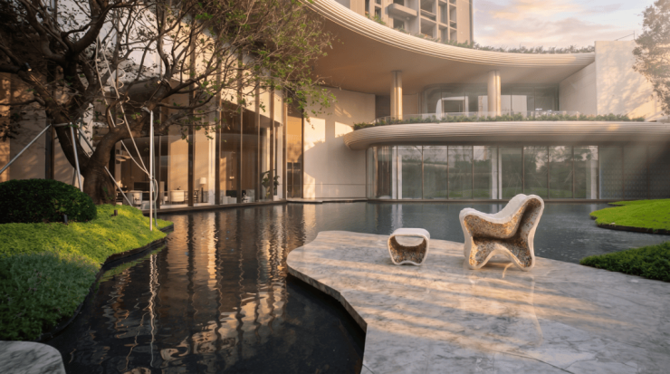 大门内侧直达9 米超高挑高车马厅,豪宅标配落客仪式,车行直达地下、人行步入园林完全分流;穹顶弧形天花 + 嵌入式灯光系统,中央镜面水景,藏风生水起之意,光影静谧高级。