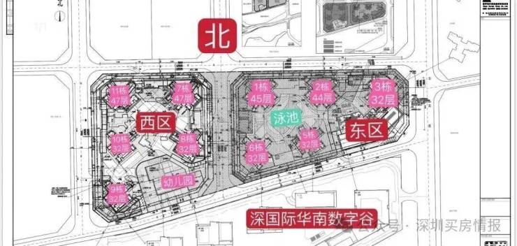 西区:占地2.2万㎡,容积率5.16,包含住宅、商业、幼儿园学校和其它基础配套设施。7栋栋总高47F,3T6户;8栋、9栋、10栋总高32F,2T5户;11栋总高46F,3T6户,2T5户;1栋是幼儿园。