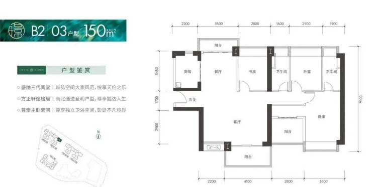 150㎡的4房2厅2卫,设计的是竖厅格局,南北通透双阳台,客厅6.3米大开间,进门入户玄关,4个卧室分别做到了3.5米/2.9米/2.8米/2.8米的宽度,U型厨房,卫生间干湿分离,得房率:75.66%(不含赠送),客厅阳台主朝西南向。