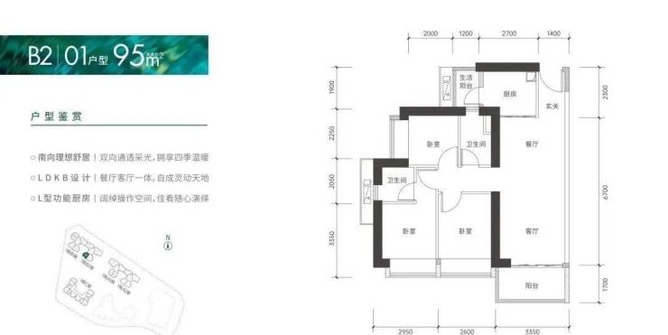 95㎡的3房2厅2卫,仅1栋B2座01户型,设计的是竖厅格局,客厅3.35米开间,进门入户玄关,LDKB一体化设计,3个卧室分别做到了2.95米/2.6米/2.25米的宽度,L型厨房还带1个小生活阳台,卫生间干湿分离,得房率:75.66%(不含赠送),阳台朝西南向。