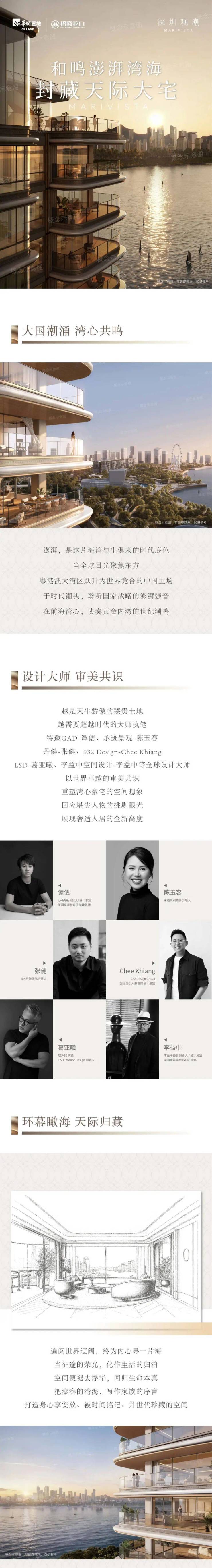 融贯全球的大师审美:深圳观潮力邀全球大师团队联袂创作。由gad谭偲执笔建筑设计;承迹景观创始人陈玉容勾勒景观美学;丹健雕琢会所空间,932设计、LSD、李益中团队共创室内空间。共同将超越时代的审美智慧凝练为可触摸、可栖居的艺术作品。